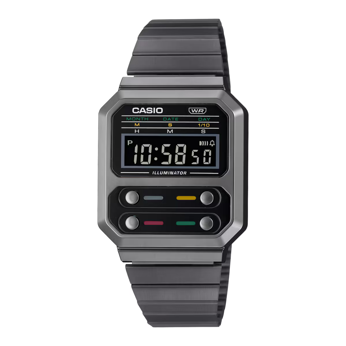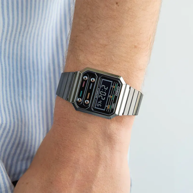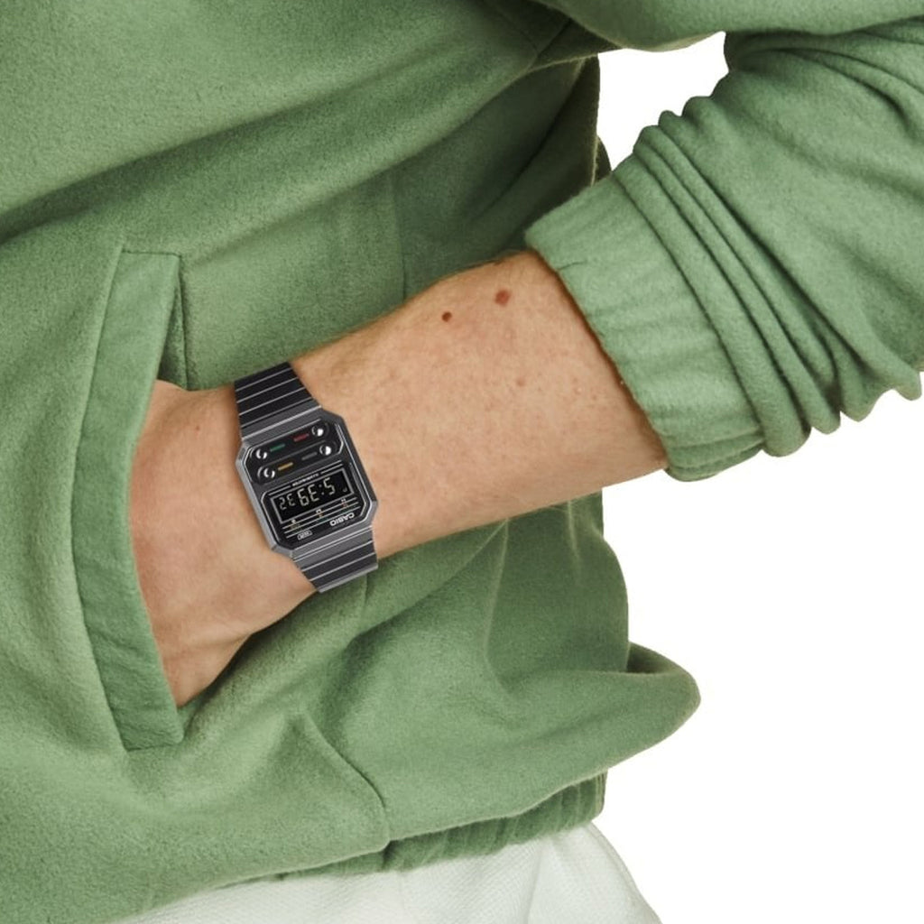 Casio A100WEGG-1A retro futurista en acabado gunmetal que suma carácter sin esfuerzo.
