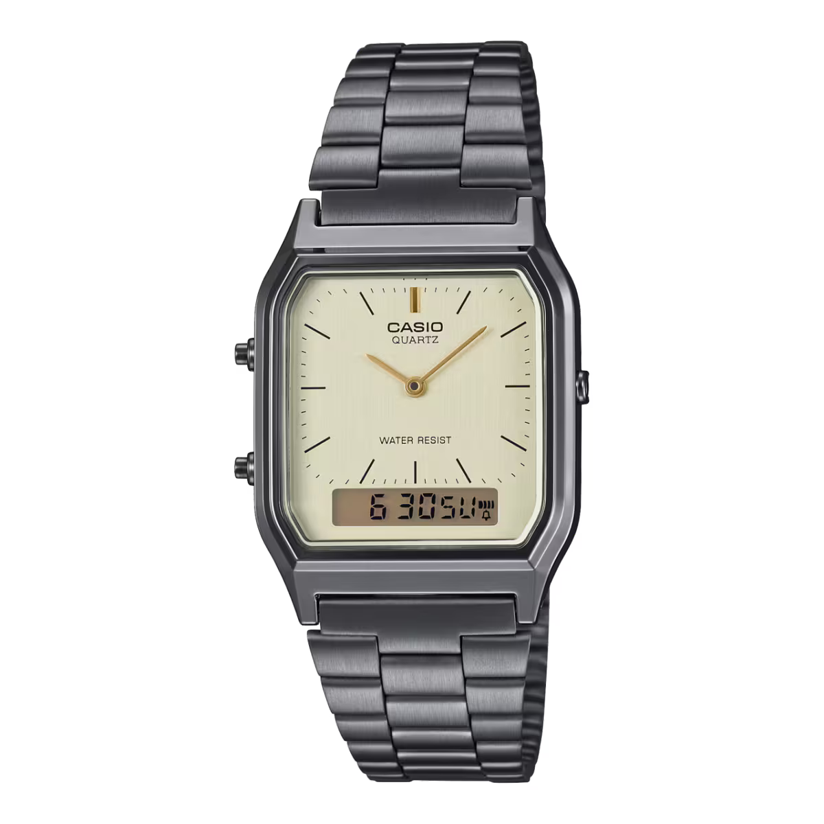 El Casio AQ-230GG-9A combina elegancia retro en acabado dorado con formato ana-digi compacto.