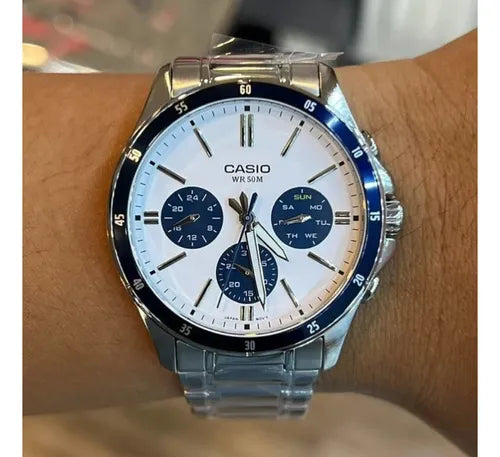 Casio MTD-130D-1A2V - acero sólido con acentos azules que marcan carácter.